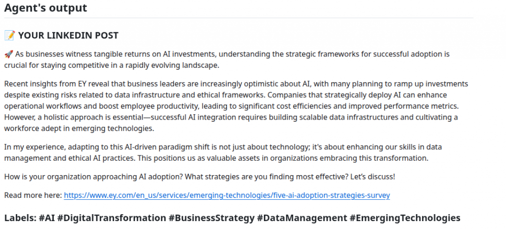 El LinkedIn News Agent demuestra de forma práctica las capacidades de un sistema de Agentic AI, al completar de manera automatizada un flujo completo de generación de contenido —desde la obtención de información hasta la publicación verificada—. Como se observa en la Figura 4, el sistema genera una publicación final depurada y contrastada, que incluye una introducción breve, ideas estructuradas y hashtags relevantes, todo ello derivado de fuentes verificadas. El resultado mantiene un tono profesional y una secuencia lógica coherente, mostrando la integración efectiva de los módulos de búsqueda, resumen, verificación y composición dentro de un flujo coordinado. Este resultado pone de relieve no solo la capacidad del sistema para realizar automatizaciones fiables, sino también el potencial de las arquitecturas Agentic AI para fomentar una difusión de información transparente y de alta calidad en entornos profesionales.