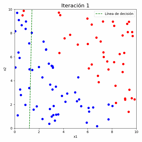 En cada iteración durante la fase de ajuste de parámetros, dibujamos la línea de separación junto con los puntos de datos. La línea se actualiza a medida que los pesos (